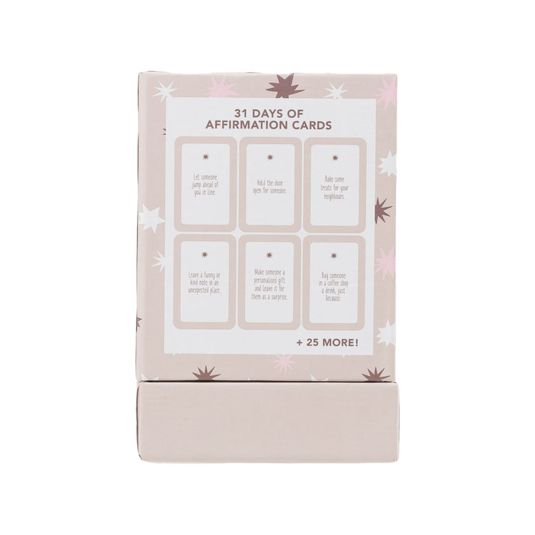 Details: 31 full coloured affirmation cards inside full printed cardboard box that doubles as the card holder/stand.