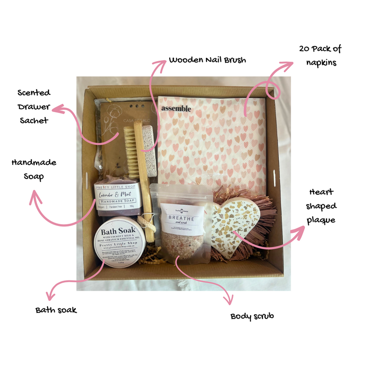 Napkins, a beautiful terrazzo decorative heart and a scented drawer sachet complete the gift box.