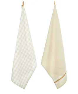 The set of two includes one gingham tea towel in soft white & beige with the second in plain beige to complement. Both come with tabs so ideal to hang to keep dry and fresh in between uses.